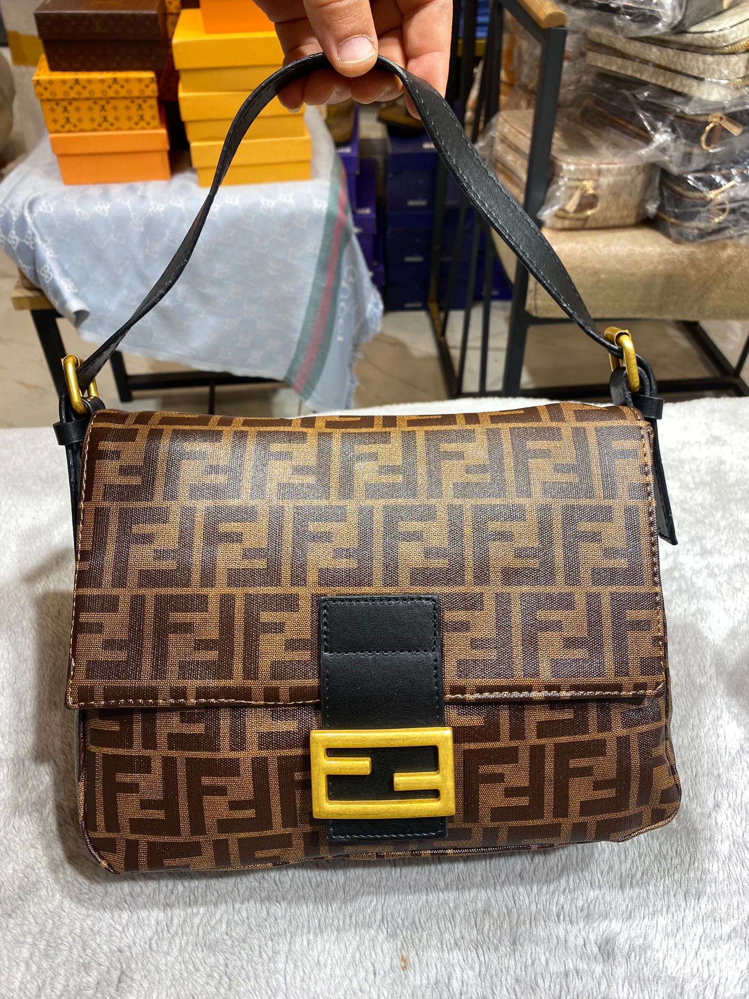 This Fendi handbag is crafted from brown nylon canvas and features silver hardware.