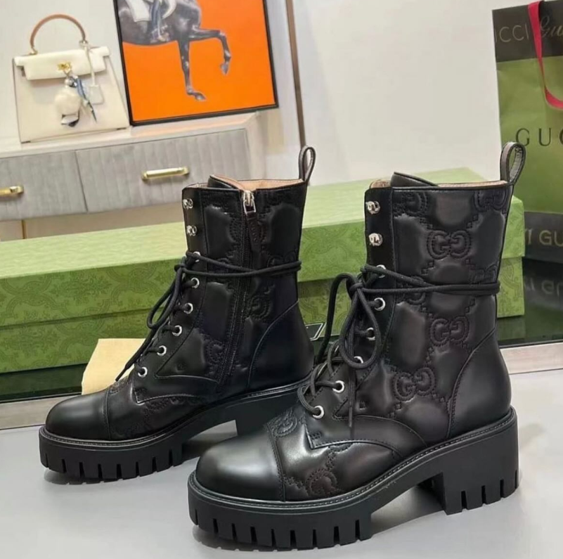 Gucci riffs on mountaineering codes with these Italian-made black boots, which are shaped from GG Matelassé leather and anchored by a chunky rubber lug sole.