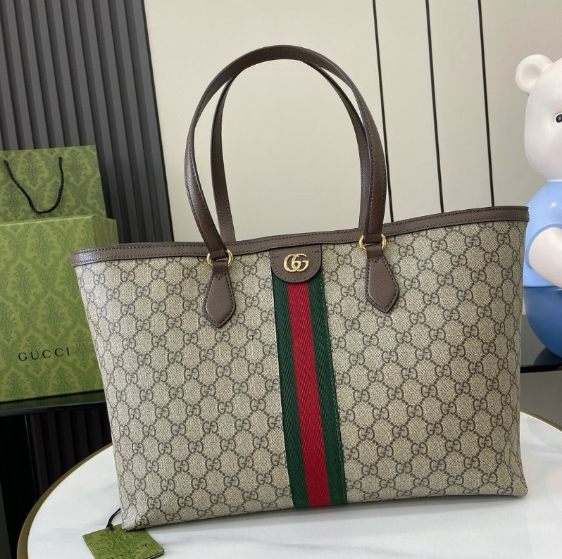 This is a Gucci "Ophidia" style shoulder bag in large size in brown leather and Supreme canvas. The bag has a magnetic closure. The lining is beige suede, and the hardware is gold. This shoulder bag is suitable for both business and casual occasions and features Gucci's Ophidia motif.