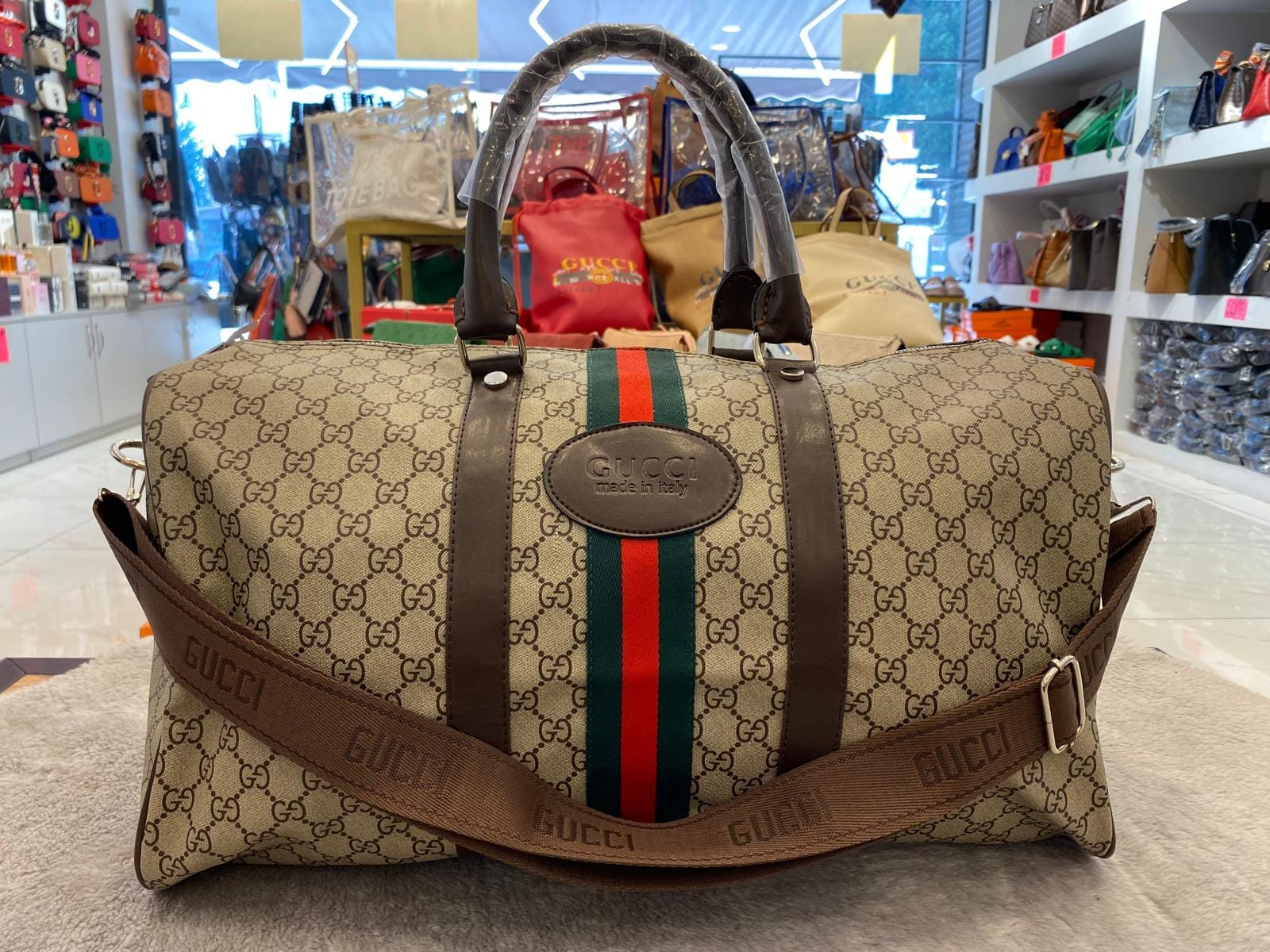 Introduced within the Gucci Savoy line, this duffle bag is crafted from beige and ebony GG Supreme canvas combined with the distinctive combination of the House Web with Double G hardware. The top-handle shape is also equipped with an adjustable canvas strap so it can be worn on the shoulder. A secure zipper closure completes the silhouette.