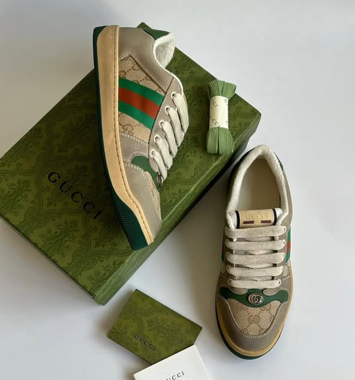 A mini version of the recognizable trainer from the men's and women's collection presented Pre-Fall 2020. Influenced by classic trainers from the '70s, the Screener—named for the defensive sports move—feature the Web stripe on the side and vintage Gucci logo, treated for an allover distressed effect.