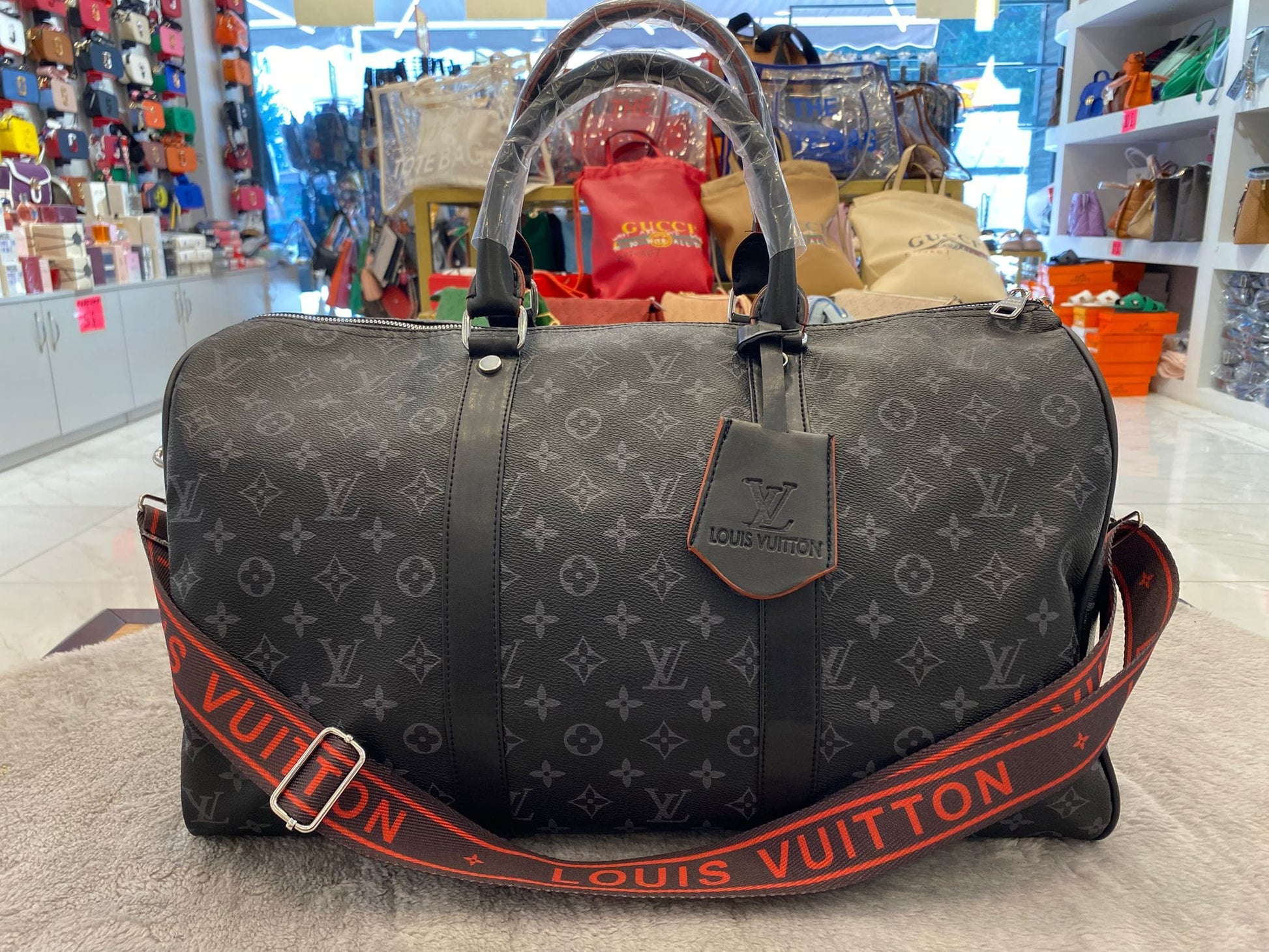The Keepall Bandoulière travel bag looks elegant in Monogram Eclipse coated canvas with black-leather trim and top handles. This cabin-friendly bag features the all the details associated with the historic Keepall line: lateral leather bands, rolled-leather top handles, padlock and removable name tag. The roomy interior includes a zipped pocket to keep things organized.