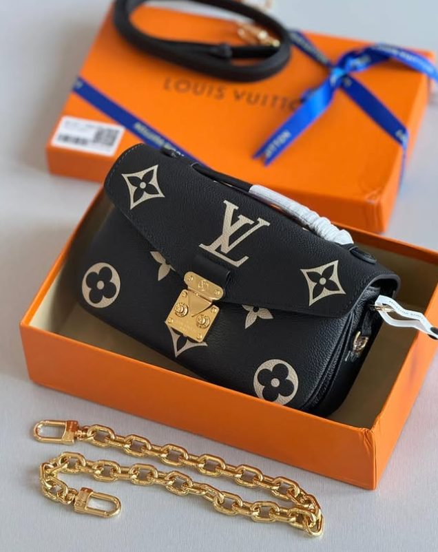Crafted from embossed Monogram Empreinte leather, the bicolor East-West edition of the Pochette Métis sports an oversized version of the signature motif. At once sophisticated and squarely on-trend, this versatile day-to-evening bag can be worn on the shoulder with its detachable golden chain, cross-body with the adjustable smart strap, or carried by hand thanks to the chic top handle.