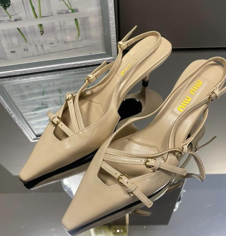A classic style meets Miu Miu's rebellious soul in these patent leather slingbacks. The buckles introduce a refined contrast and add an irreverent touch to the shoe, giving it a strong personality.