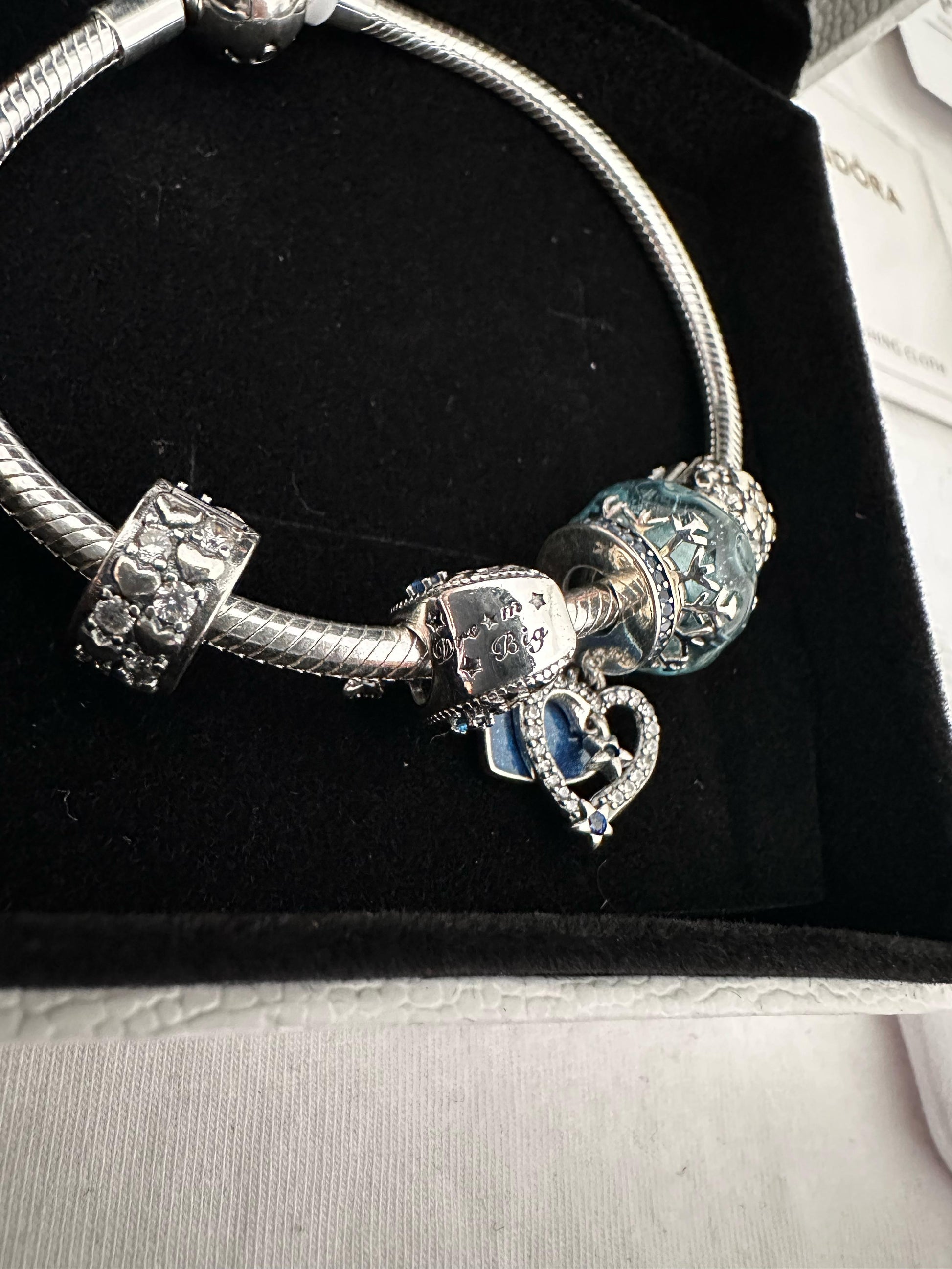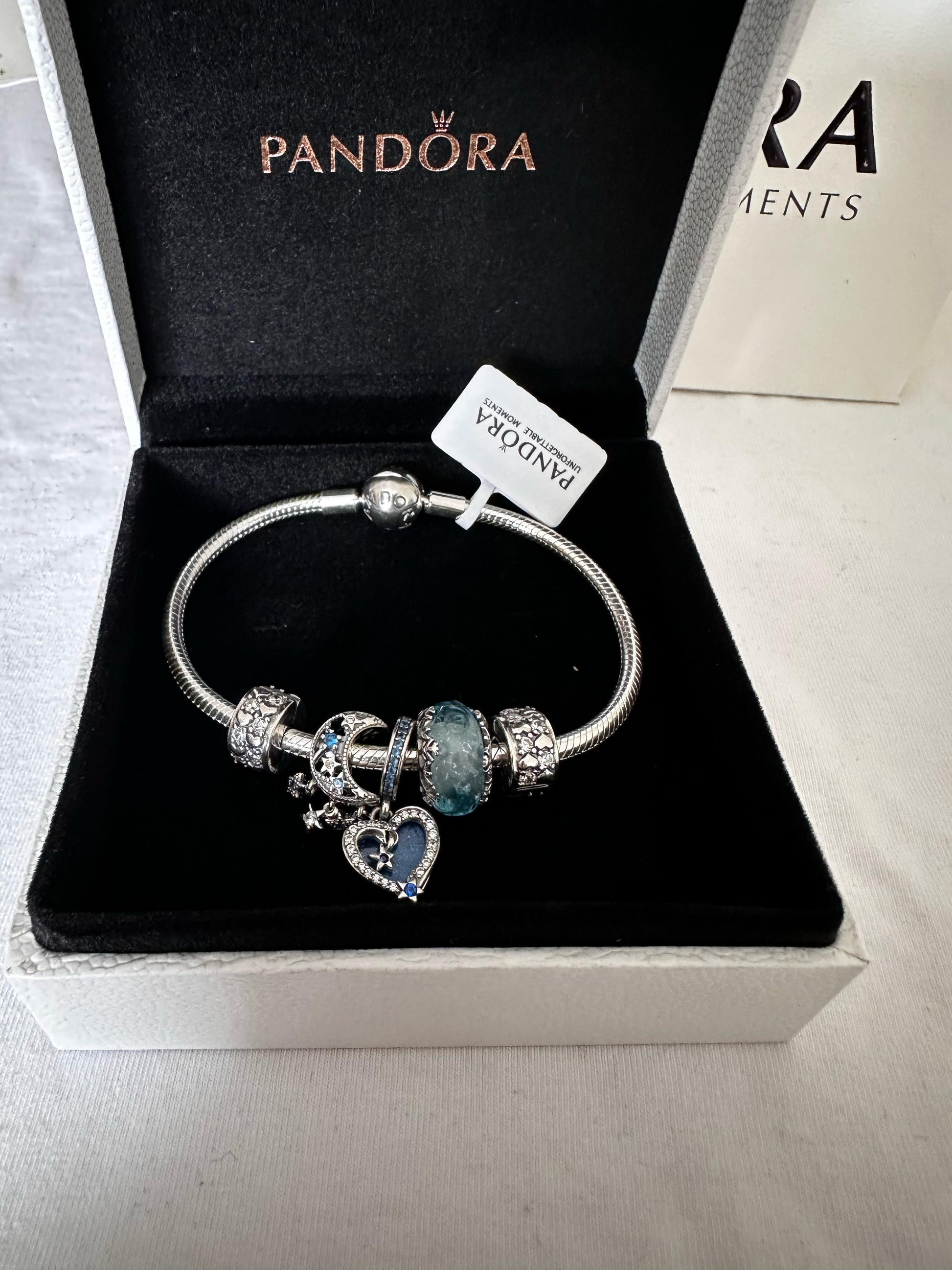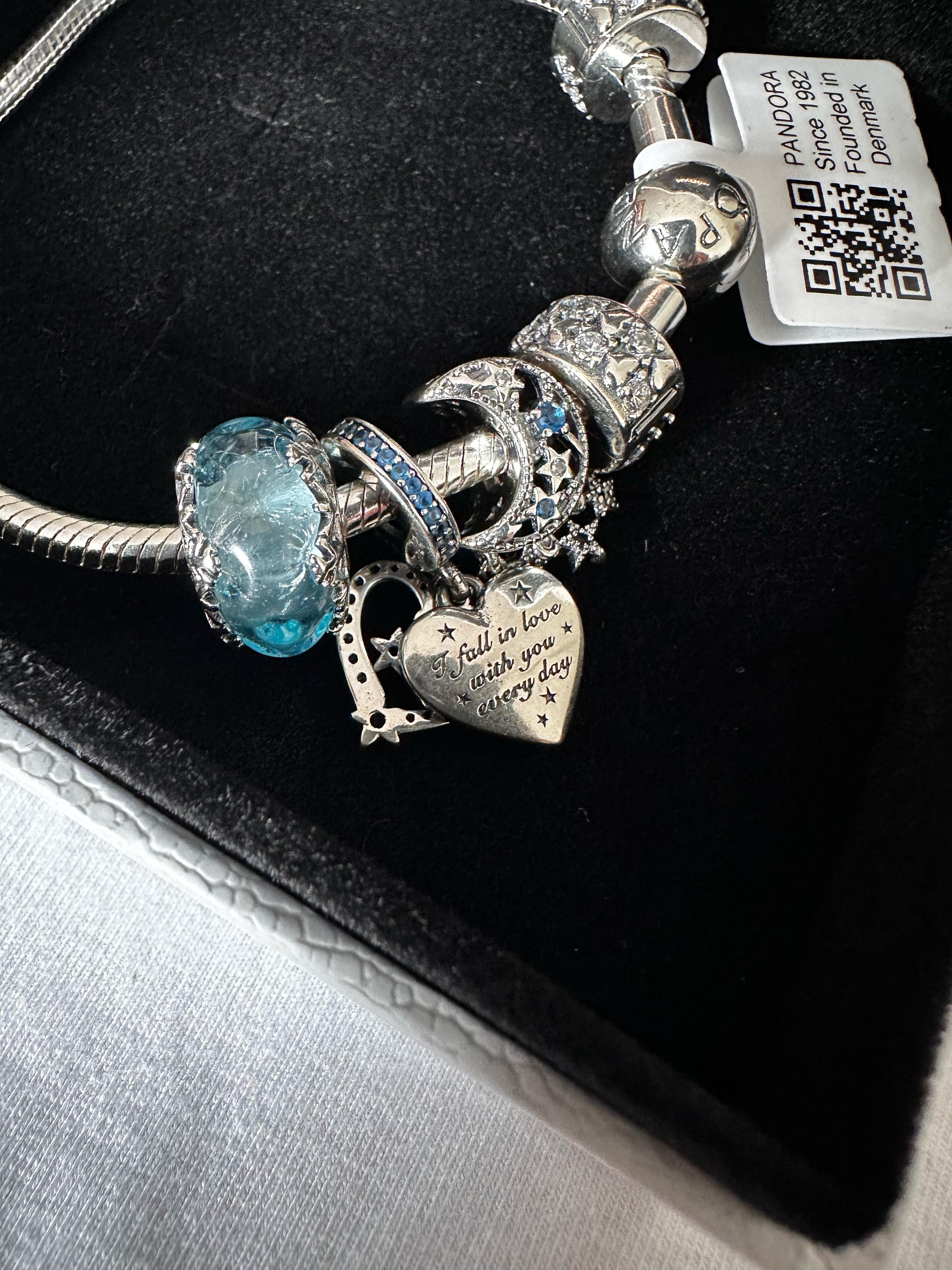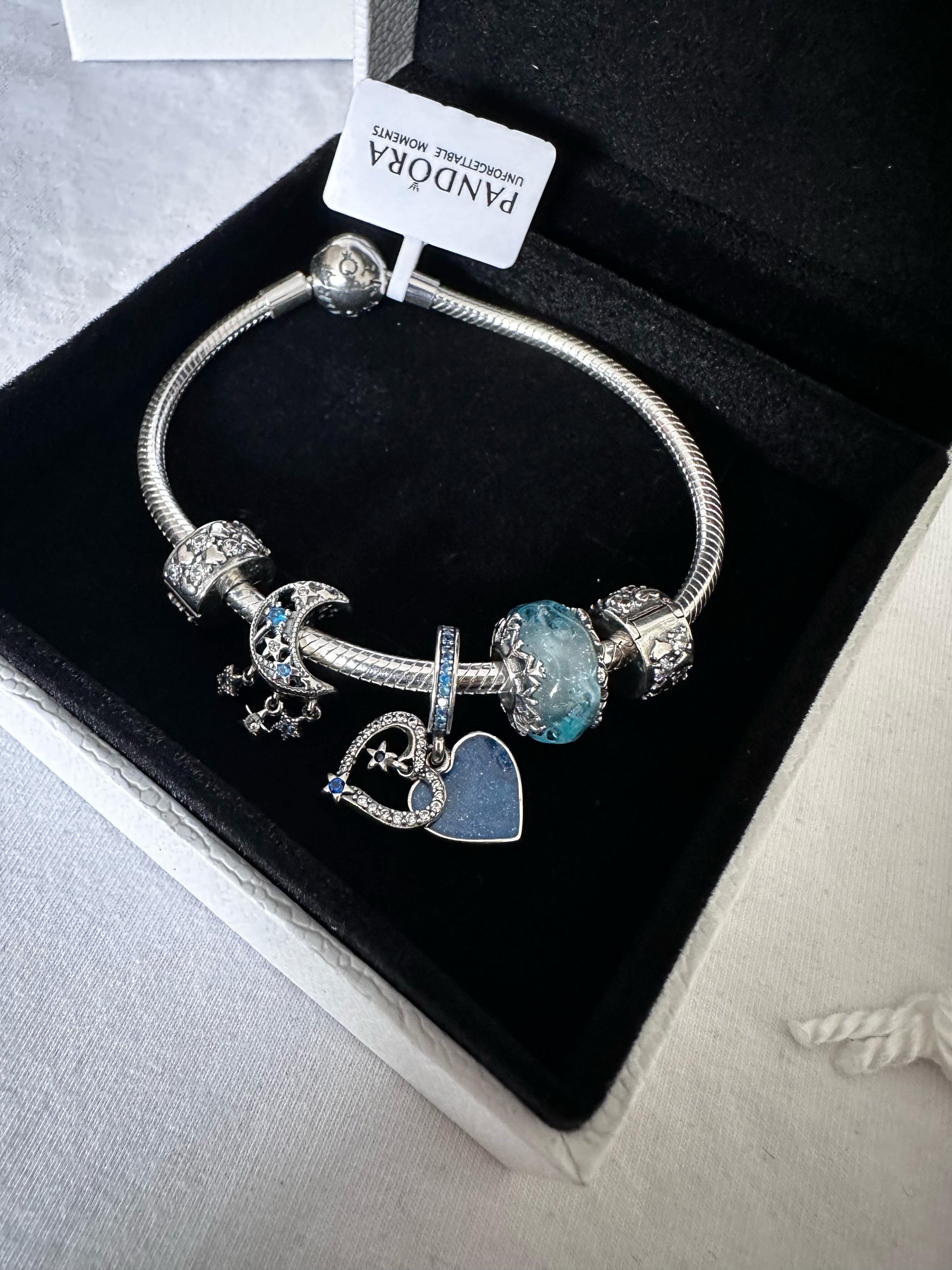 Beautiful and original Pandora bracelet in sterling silver, adorned with 5 stunning charms in blue, silver, and crystal tones. The charms include celestial and romantic motifs such as stars, moon, heart, and sparkling pavé details. Each piece is intricately designed and adds a touch of elegance and personality.