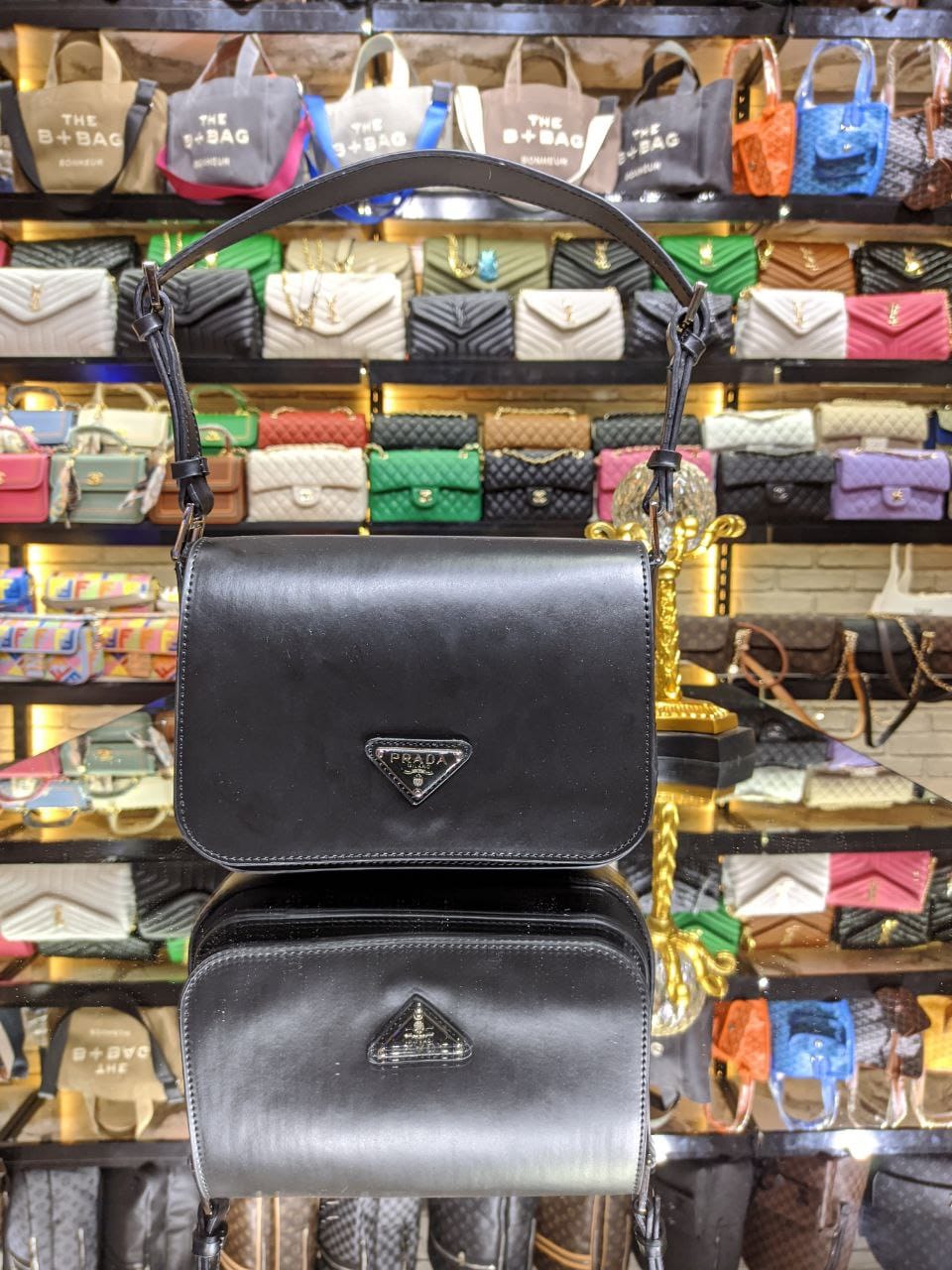 This shoulder bag is made of Saffiano leather. Prada's iconic material is synonymous of luxury and is identified with traditional Italian leather manufacturing. The iconic pouch and enameled metal triangle logo decorate the front.